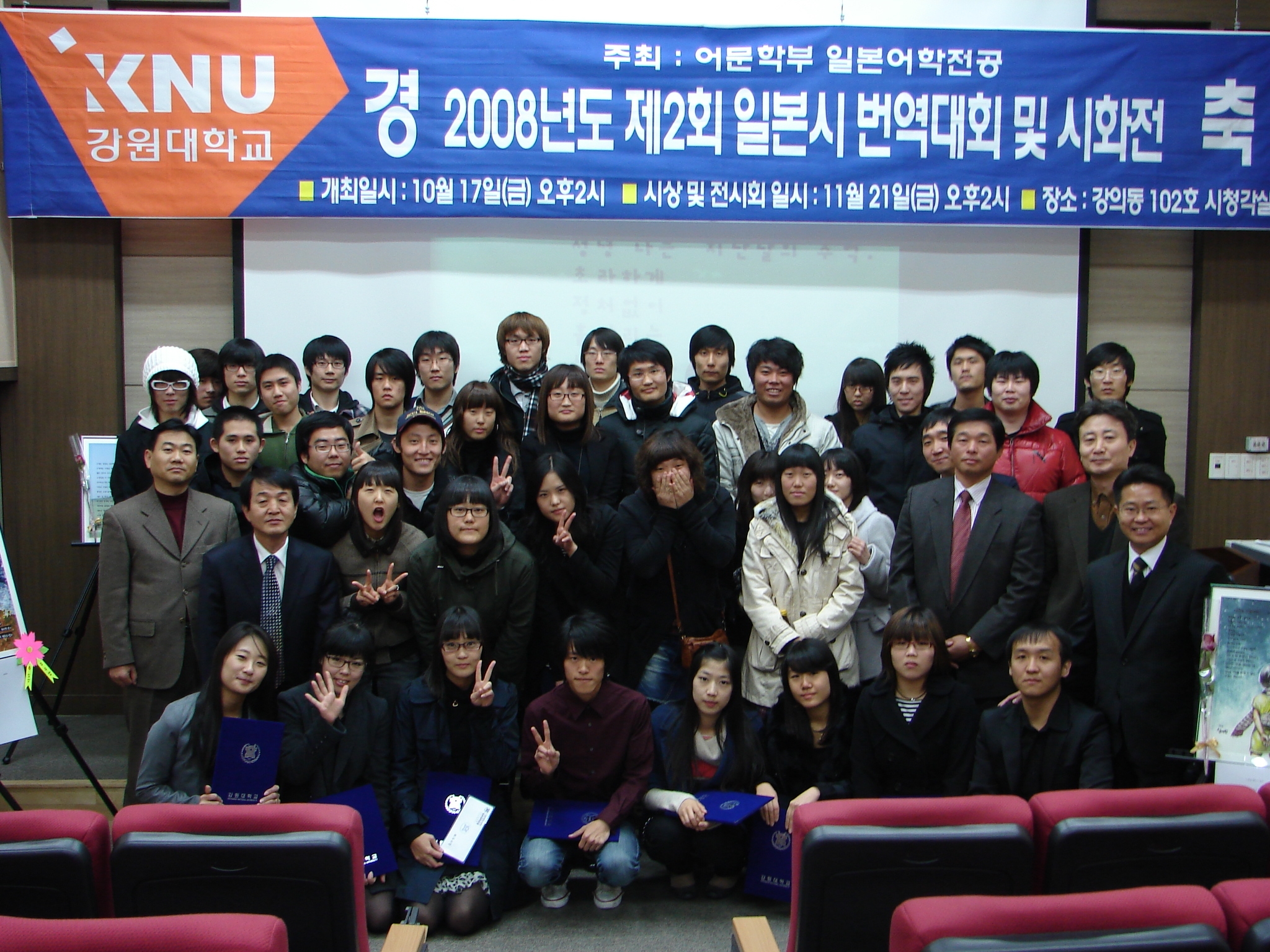 <2008년 일본시 번역대회 및 시화전 시상식> 일시:2008년 11월21일(금) 오후2시 장소:강의동 102호 시청각실 2008년 제2회 강원대학교 일본시 번역대회 시상식 및 전시회를 가졌다. 이 자리에서 입상한 9명의 학생들이 자신들이 번역한 시를 낭송하는 뜻깊은 자리도 마련하였다.