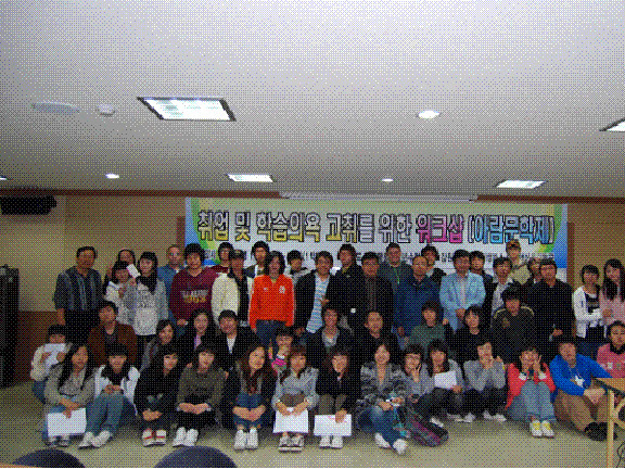 아람문학제 워크샵 2009년 5월 취업 및 학습의욕 고취를 위한 워크샵(아람문학제)을 마치며 교수님들과 학생들의 단체 사진